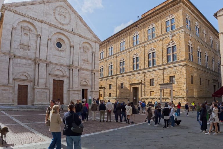 Pienza, on the left the Pienza Cathedral, on the right Palazzo Piccolomini, family palace of Pope Pius II