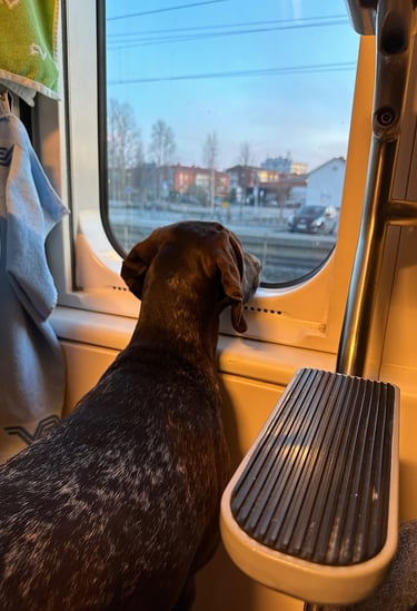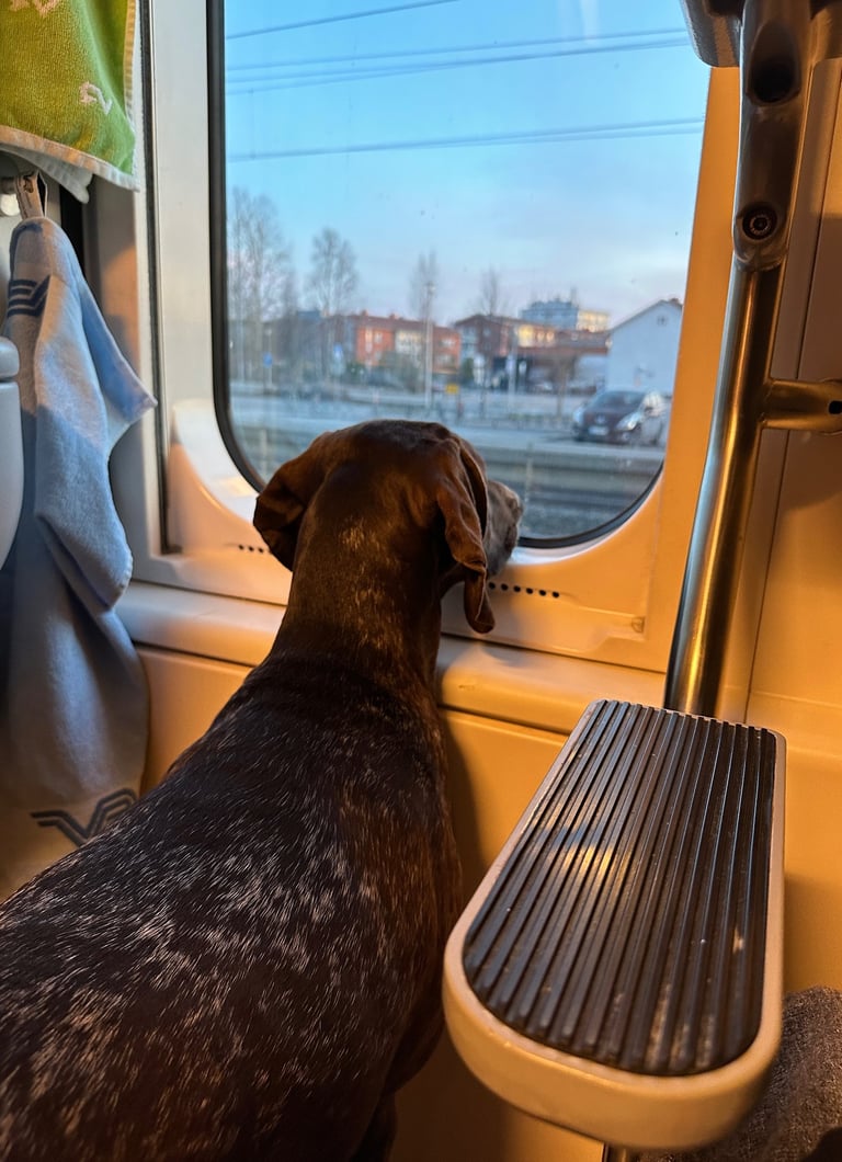 Junat, laivat ja muu joukkoliikenne voivat olla hieman haastavampia ja vaativat koiran kanssa aina jonkun verran suunnittelua. Ulkoilutustauon pitämiseen tarvitaan junareitti, jonka varrella on riittävän pitkät pysähtymistauot, ja teemmekin aina lyhyitä lenkkejä ulkona mahdollisuuksien mukaan näiden pysähdysten aikana.